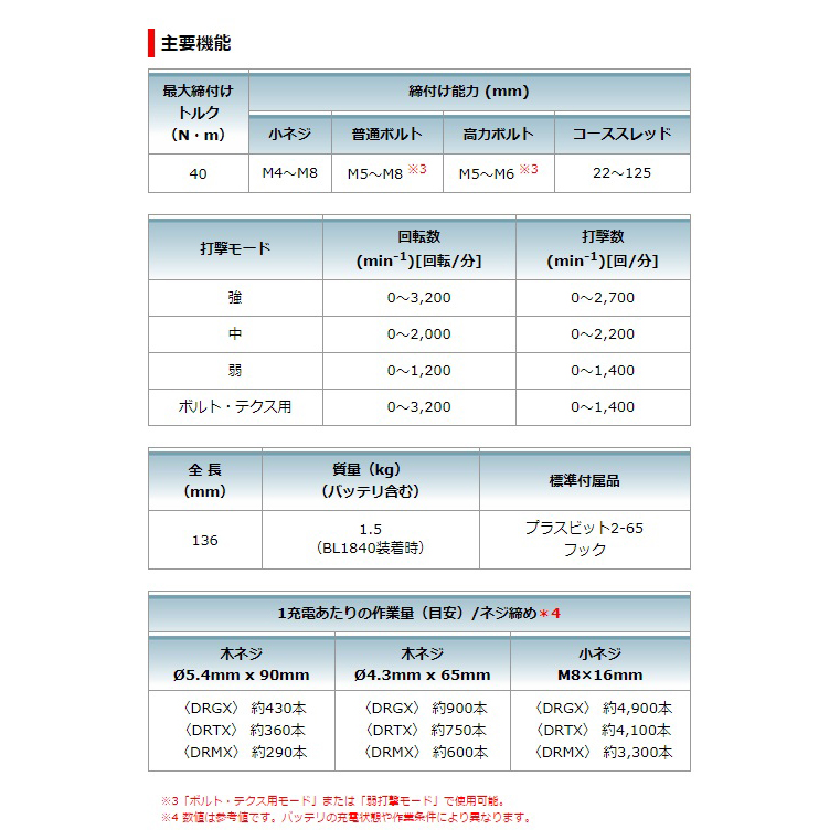 【新品】 TS141DZ/TS141DRGX ソフトインパクトドライバ マキタ 【新品】 TS141DZ/TS141DRGX ソフトインパクトドライバ マキタ (001) 「油圧式+金属打撃方式」で低騒音、さらに”連続”高速締め付け可能な次世代ソフトインパクトドライバです。 ボルト・テクスモード付き。 ・TS141DRGX(セット品)付属品 ・バッテリBL1860B×2本 ・充電器DC18RC ・ケース ・+ビット2-65 ・フック ※主要機能は、別途画像をご確認下さい。 在庫状態 : 売り切れ ¥75,000(税込) 只今お取扱い出来ません